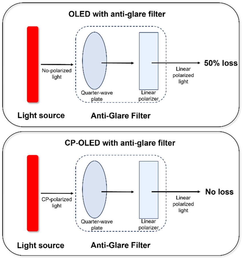 Figure 2. Schematic diagram of an OLED and CP-OLED with anti-glare filters.